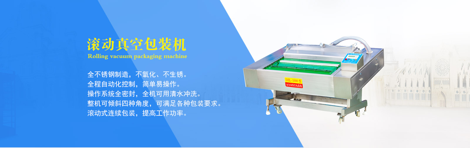 公司專業(yè)制造生產(chǎn)真空包裝機(jī)、拉伸膜真空包裝機(jī)、盒式真空包裝機(jī)、斬拌機(jī)、滾揉機(jī)、鹽水注射機(jī)、巴氏殺菌流水線等食品機(jī)械。其中生產(chǎn)的DZL-420全自動拉伸膜真空包裝機(jī)、DZL-1000型連續(xù)自動真空包裝機(jī)、真空滾揉機(jī)、斬拌機(jī)、鹽水注射機(jī)等都是通過本市技術(shù)監(jiān)督局檢驗(yàn)合格的產(chǎn)品。